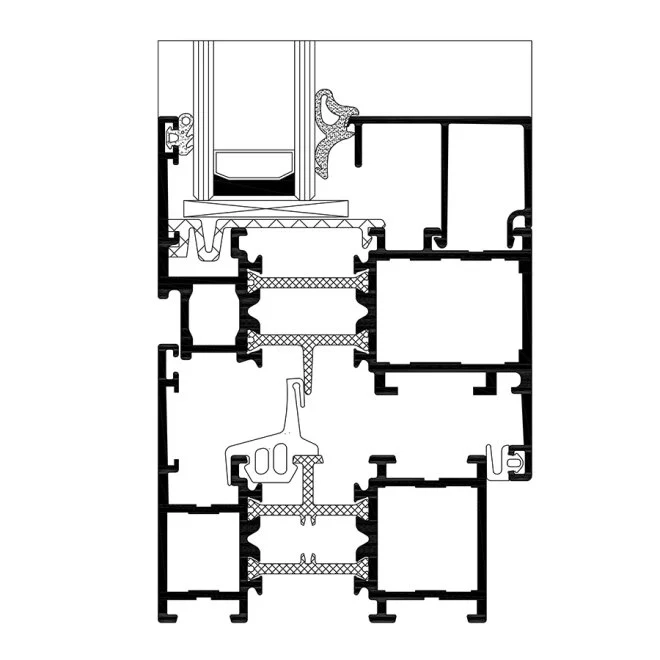 La struttura del sistema è basata su profili in alluminio con una profondità di 65 mm nel telaio e 74 mm nell’anta.